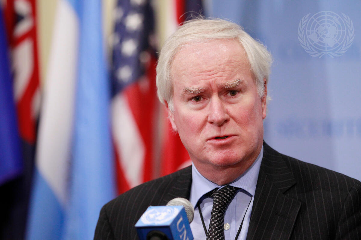 Mark Lyall Grant, Permanent Representative of the United Kingdom to the UN, speaks to journalists following a closed-door briefing to the Security Council by members of the UN Commission of Inquiry on Syria.
