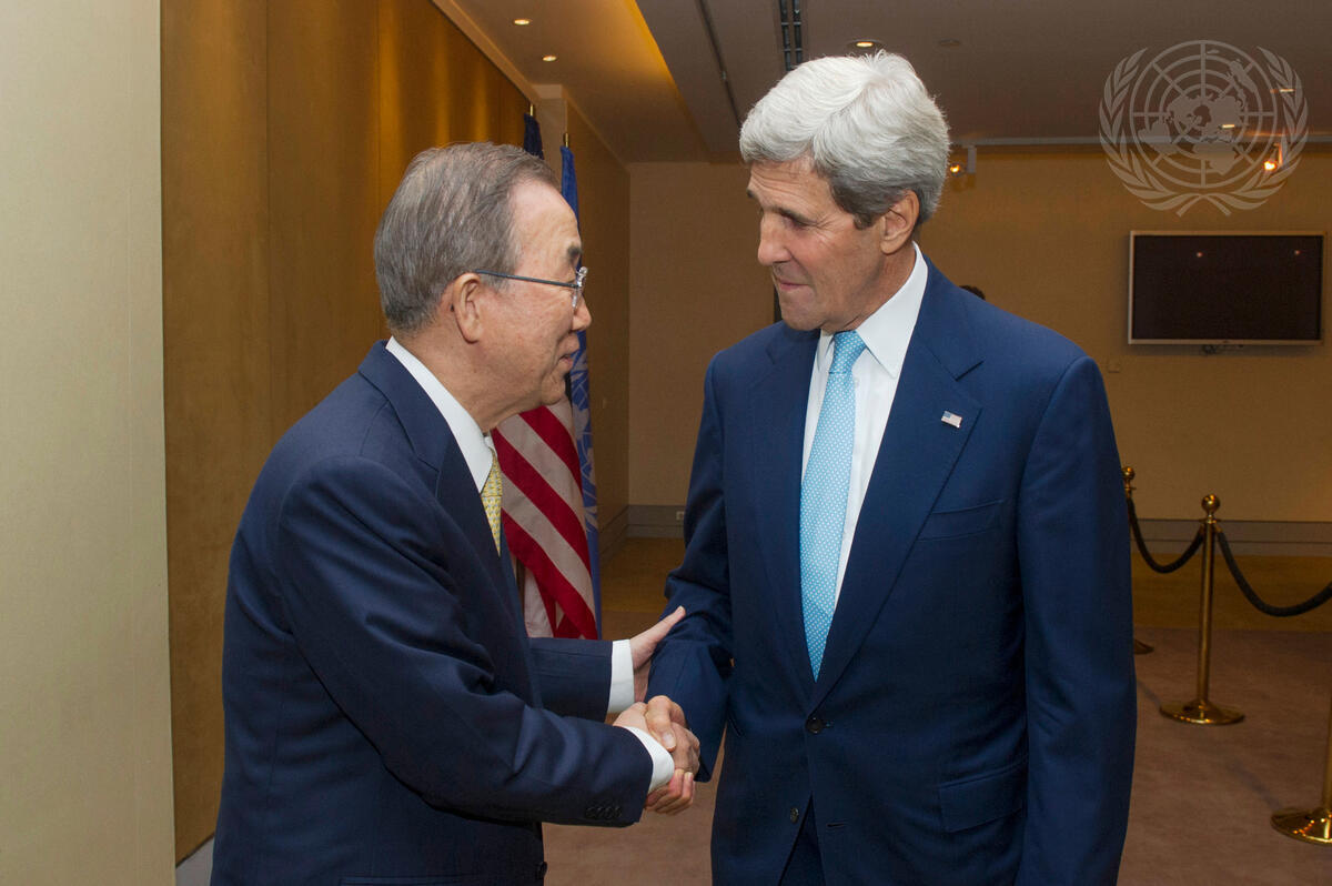 Secretary-General Ban Ki-moon (left) meets with United States Secretary of State John Kerry upon arrival in Cairo.