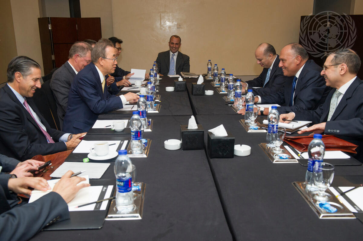 Secretary-General Ban Ki-moon (centre left) meets with Sameh Hassan Shokry Selim (centre right), Minister for Foreign Affairs of the Arab Republic of Egypt.