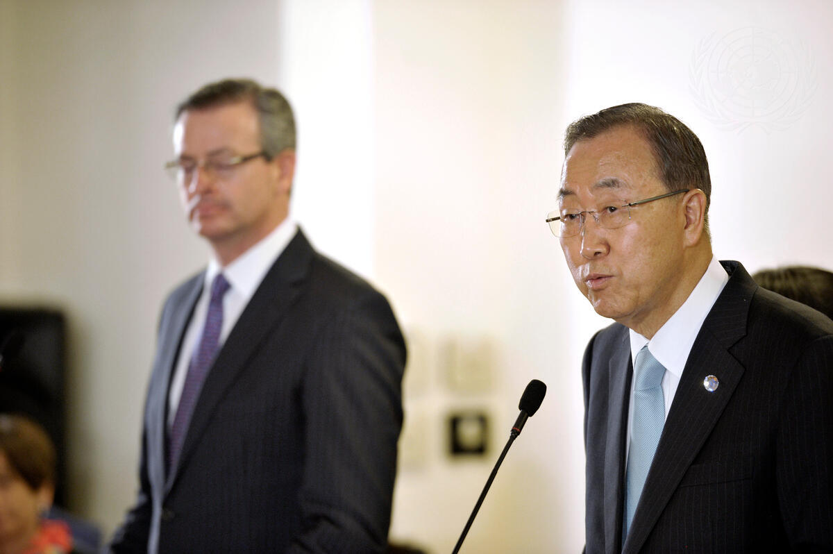 Secretary-General Ban Ki-moon (right) speaks to journalists during his joint press conference with Manuel González Sanz, Minister for Foreign Affairs of Costa Rica.