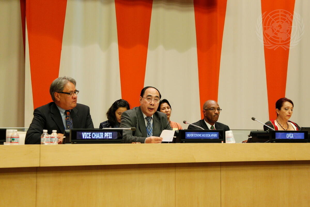 Wu Hongbo (second from left, on dais), Under-Secretary-General for Economic and Social Affairs and Coordinator of the Second International Decade of the World's Indigenous Peoples, speaks at the event. On his right is Grand Chief Edward John, Vice-Chairperson of the Permanent Forum on Indigenous Issues.