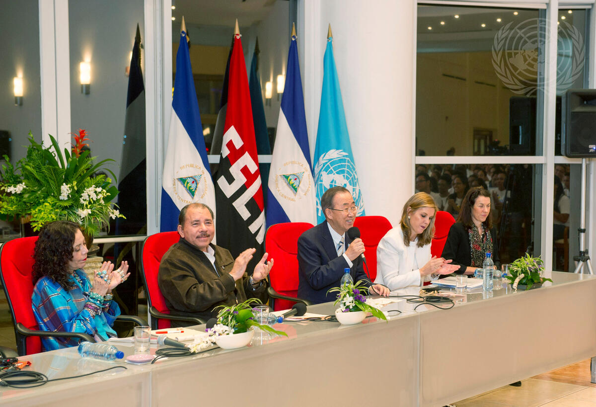 Secretary-General Ban Ki-moon (centre) addresses youth at an event with Daniel Ortega Saavedra (second from left), President of Nicaragua.