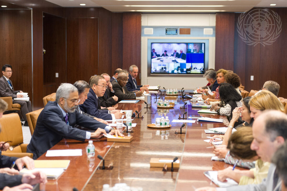 Secretary-General Ban Ki-moon (third from left) chairs a UN system-wide coordination meeting the Ebola virus outbreak in West Africa, which the World Health Organization (WHO) has declared a public health emergency of international concern. Taking part in the meeting via video link were WHO Director-General Dr. Margaret Chan and Dr. David Nabarro, newly appointed Senior UN System Coordinator for Ebola Virus Disease.