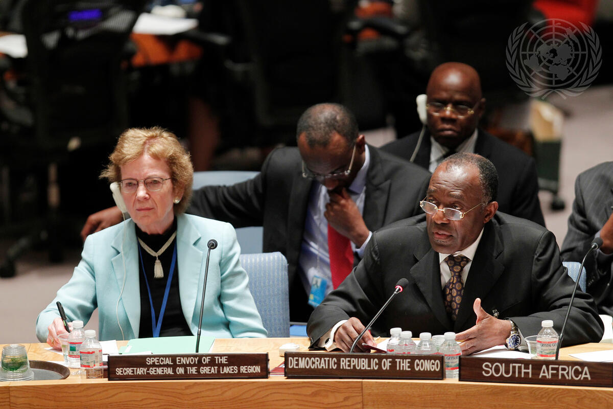 Raymond Tshibanda N'tungamulongo (right), Minister for Foreign Affairs, International Cooperation and Francophonie of the Democratic Republic of the Congo, addresses Security Council meeting on the situation concerning the his country. At left is Mary Robinson, Special Envoy of the Secretary-General for the Great Lakes Region of Africa.
