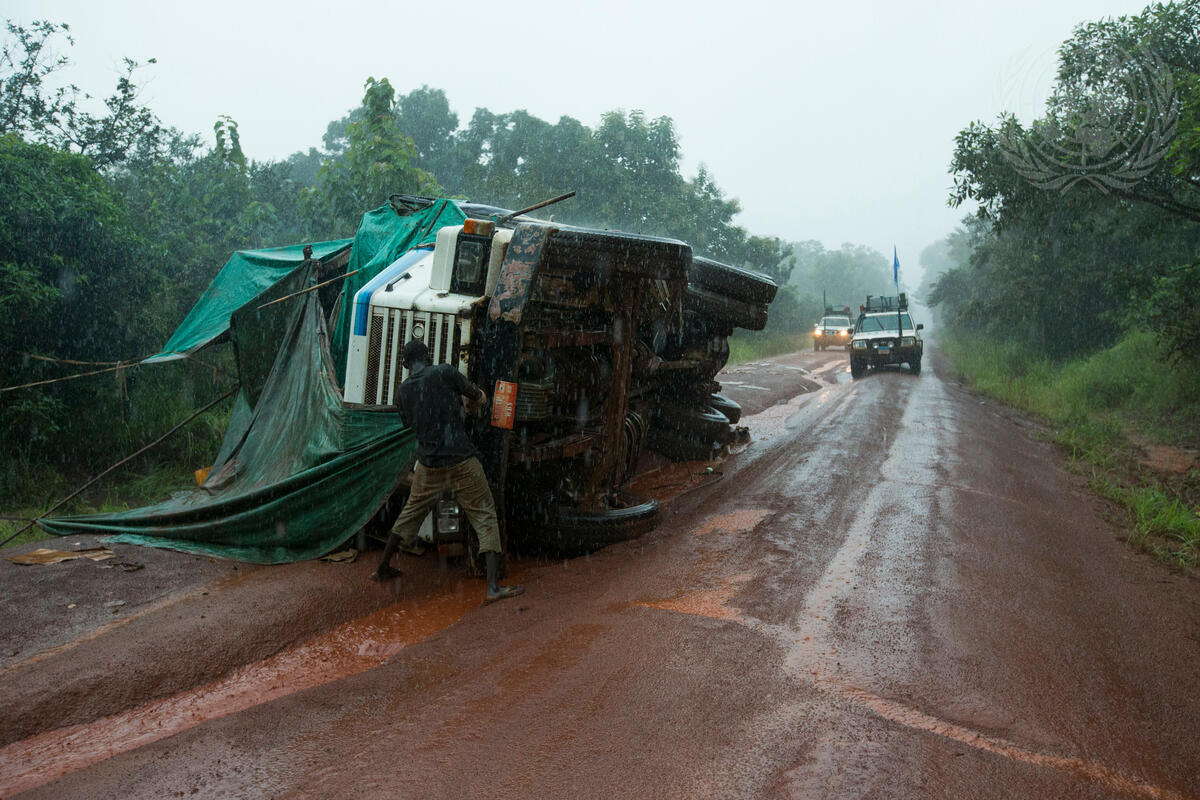 Drivers of an overturned truck set up a tarpaulin for shelter from the rain near Yambio, Western Equatoria.