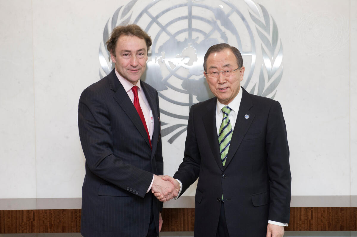 Secretary-General Ban Ki-moon (right) meets with David Harland, Executive Director of the Center for Humanitarian Dialogue.
