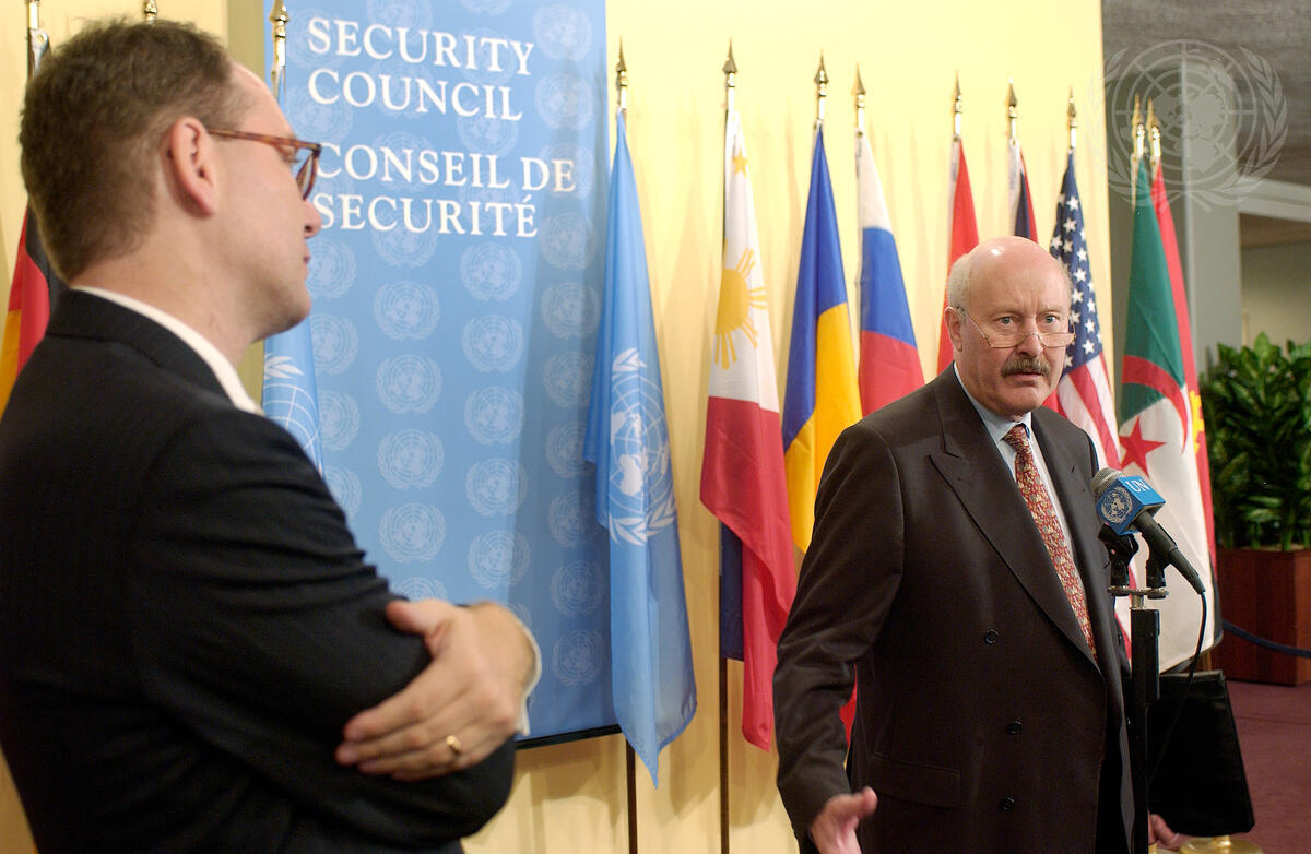 Ambassador Gunter Pleuger (right), Permanent Representative of Germany, addresses the press following Security Council consultations on Iraq.