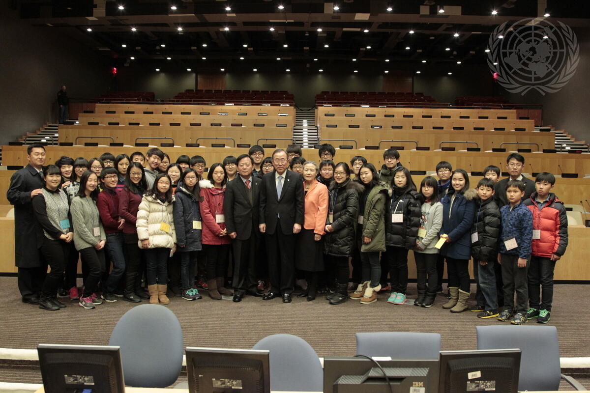Ban Ki-moon (centre), Secretary-General of the United Nations, and his wife, Yoo Soon-taek, meet with a group of students from the Republic of Korea who are visiting the United Nations Headquarters in New York.