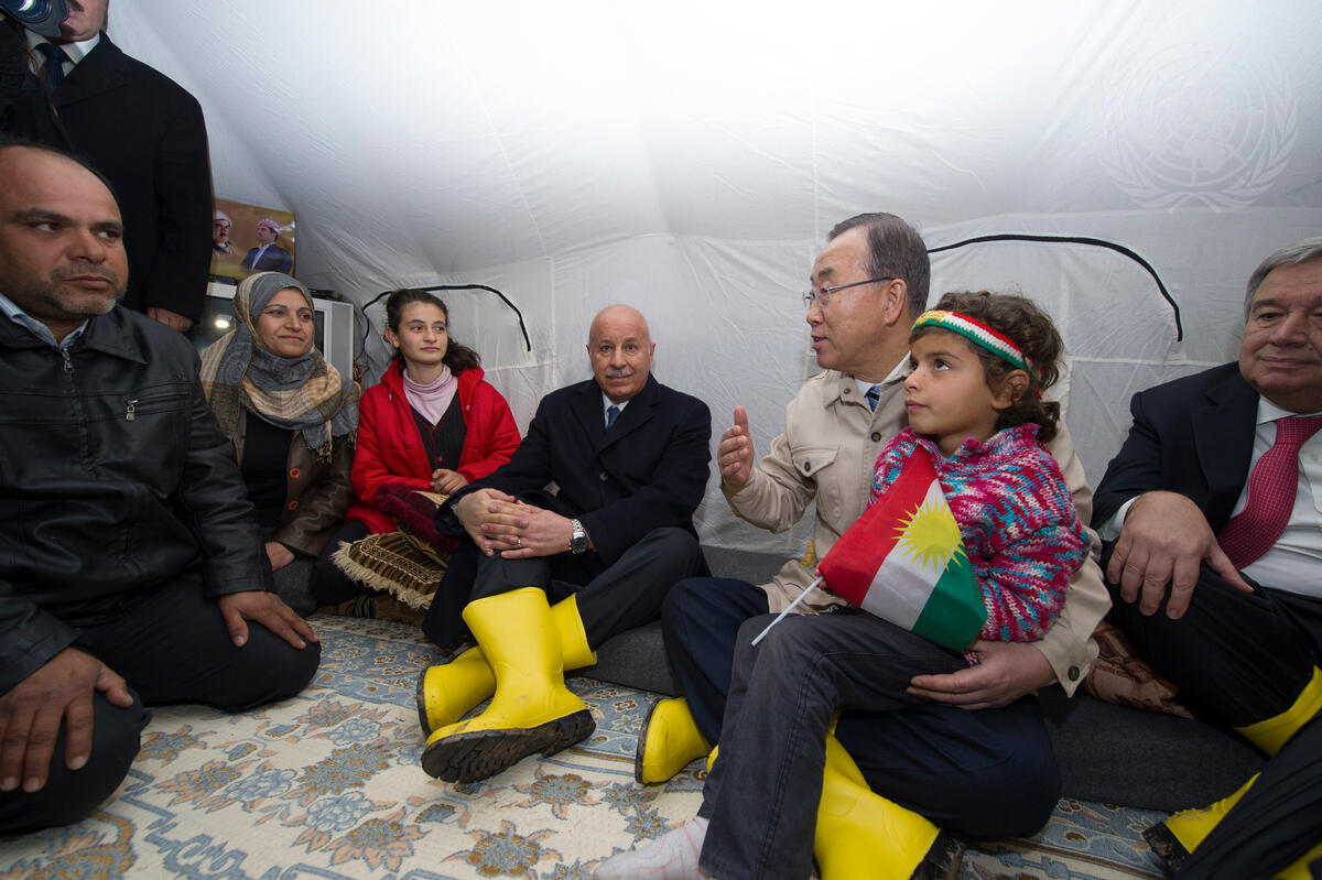 Secretary-General Ban Ki-moon visited the Kawrgosik Refugee Camp near Erbil, in the Kurdistan region of Iraq, where more than 200,000 refugees from Syria are being hosted by the regional government. He was joined by António Guterres, UN High Commissioner for Refugees, and Valerie Amos, Under-Secretary-General for Humanitarian Affairs.