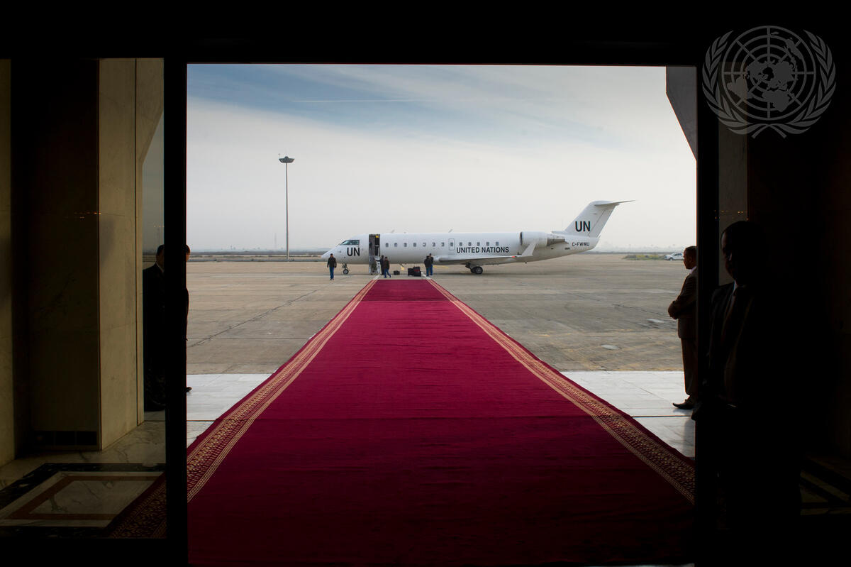 A view of a UN plane outside the Baghdad Airport, from where the Secretary-General will travel today to Erbil, in the Kurdistan region.