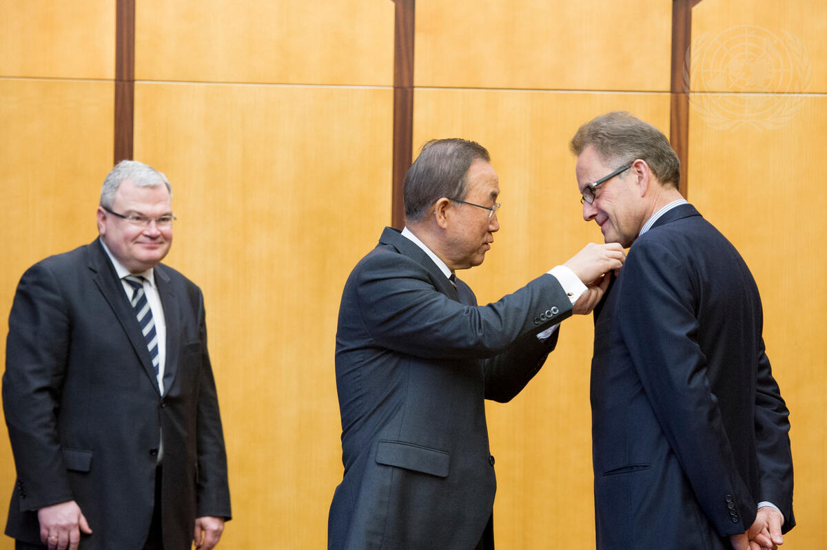 Secretary-General Ban Ki-moon (centre) affixes a UN lapel pin for Michael Møller after he is sworn in as Acting Director-General of the United Nations Office at Geneva (UNOG).