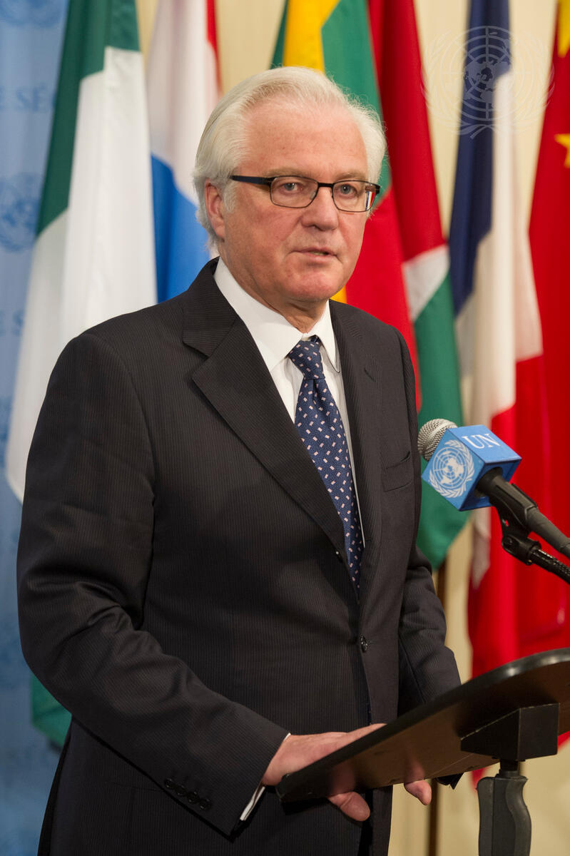 Vitaly I. Churkin, Permanent Representative of the Russian Federation to the UN, briefs the press after a Security Council meeting on the situation in Ukraine.