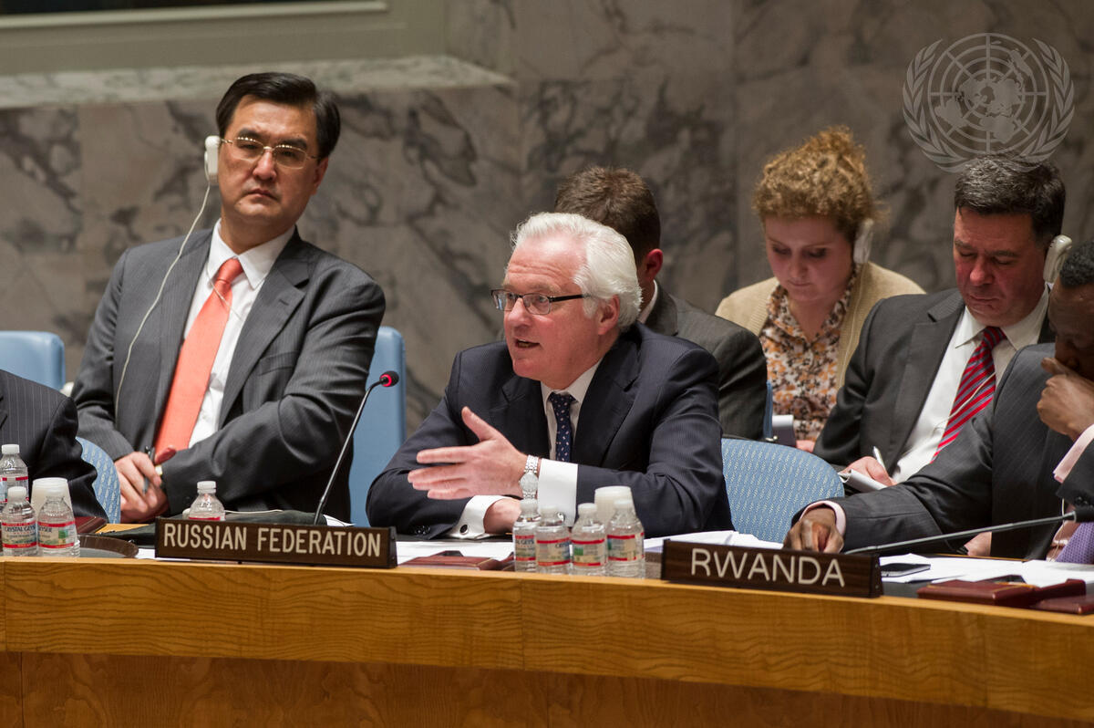 Vitaly I. Churkin (center), Permanent Representative of the Russian Federation to the UN, addresses the Security Council meeting on the situation in Ukraine.