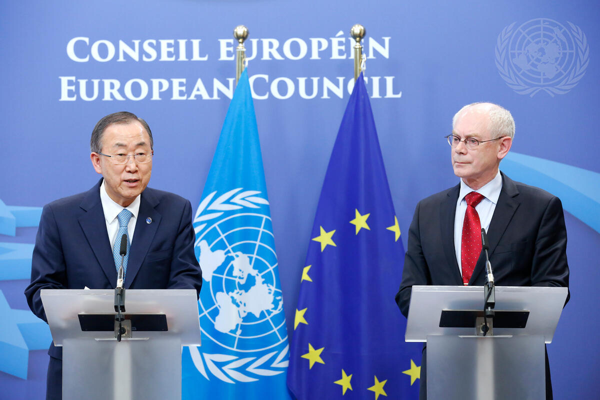 Secretary-General Ban Ki-moon (left) addresses journalists jointly with Herman Van Rompuy, President of the European Council.