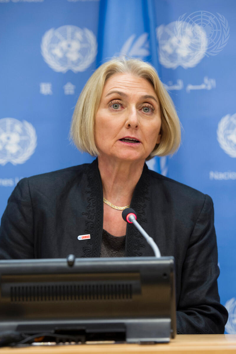 Agnès Marcaillou, Director of the UN Mine Action Service (UNMAS), briefs the press on the occasion of International Day for Mine Awareness and Assistance in Mine Action during today's noon briefing at UN Headquarters.