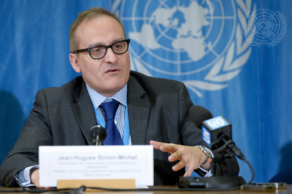 Jean-Hugues Simon Michel (France), Chair of a four-day meeting of experts on lethal autonomous weapons systems, held in Geneva under the Convention on Certain Conventional Weapons (CCW), briefs journalists on the meeting.