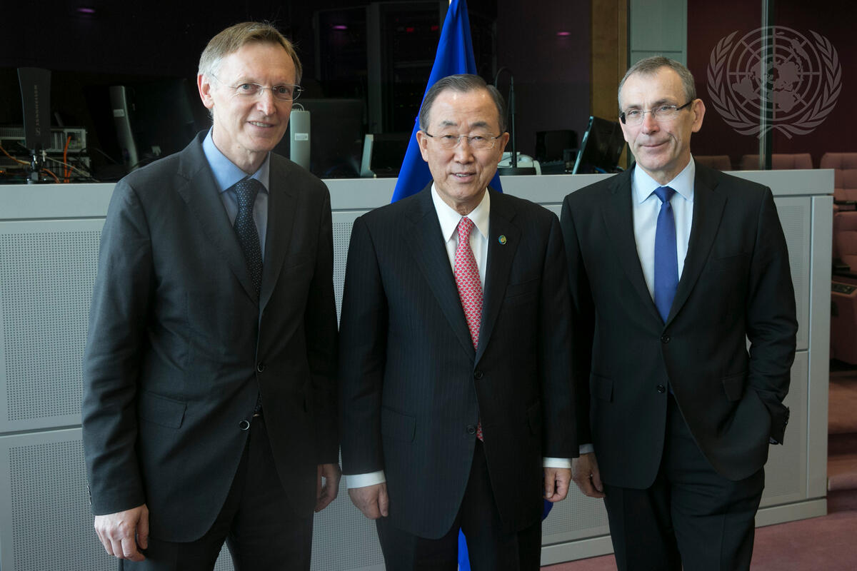 Secretary-General Ban Ki-moon (centre) meets with Janez Potocnik (left), European Commissioner for the Environment at the European Commission, and Andris Piebalgs, European Commissioner for Development at the European Commission, in Brussels.
