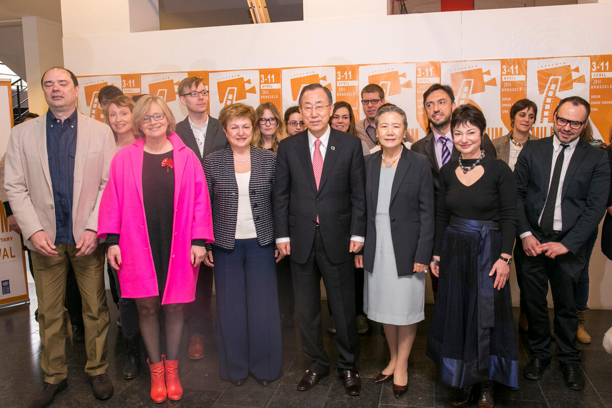Secretary-General Ban Ki-moon (centre) and his wife, Yoo Soon-taek (right of Mr. Ban), pose with guests and organizers at the preview of this year's Millennium International Documentary Film Festival, which will run take place the 3-11 of April, in Brussels. Tonight's event is being held at CIVA, the International Center for the City, the Architecture and the Landscape.