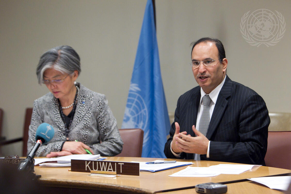 Mansour Ayyad SH A Alotaibi (right), Permanent Representative of the State of Kuwait to the UN, speaks during the ceremony in New York. At his side is Kyung-wha Kang, Assistant Secretary-General for Humanitarian Affairs and Deputy Emergency Relief Coordinator.