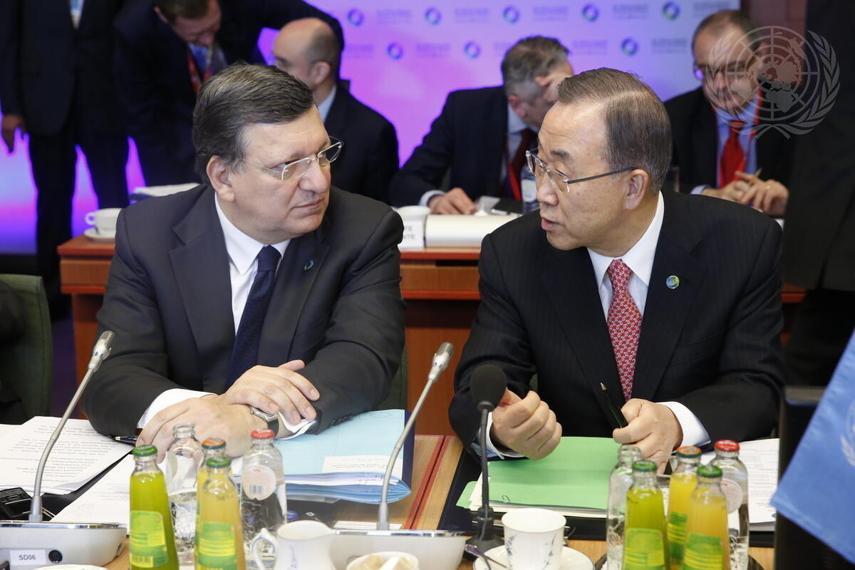 Secretary-General Ban Ki-moon (right) with Jose Manuel Barroso, President of the European Commission, during the fourth European Union-Africa summit, taking place in Brussels on 2-3 April under the theme ""Investing in People, Prosperity and Peace"".