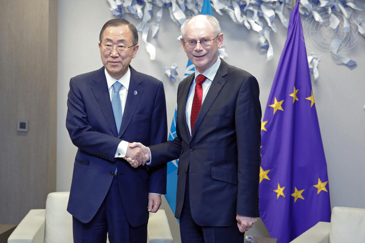 Secretary-General Ban Ki-moon (left) meets with Herman Van Rompuy, President of the European Council.