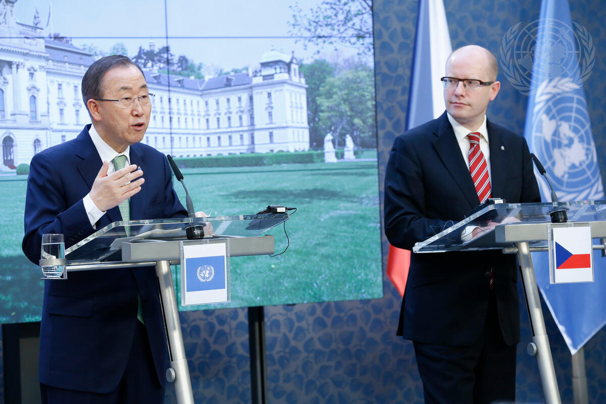 Secretary-General Ban Ki-moon (left) addresses journalists jointly with Bohuslav Sobotka, Prime Minister of the Czech Republic.