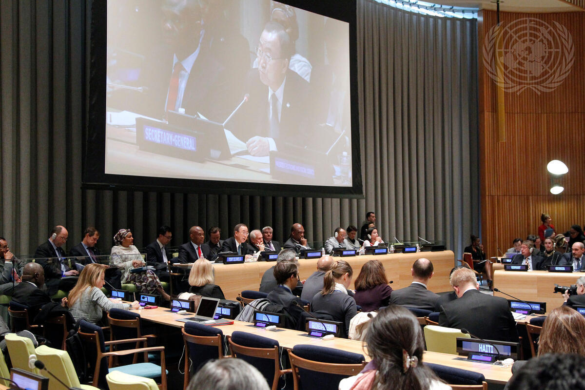 A view of the Trusteeship Council Chamber, as Secretary-General Ban Ki-moon (shown at right on screen) addresses the opening meeting of the debate.