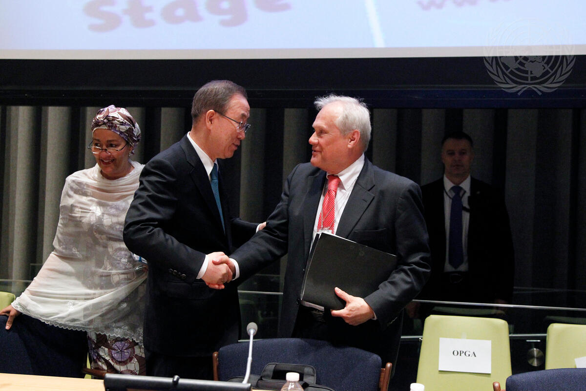 Secretary-General Ban Ki-moon (centre left) greets ECOSOC President Martin Sajdik at the opening meeting of the debate. Pictured at left is Amina J. Mohammed, the Secretary-General’s Special Adviser on Post-2015 Development Planning.