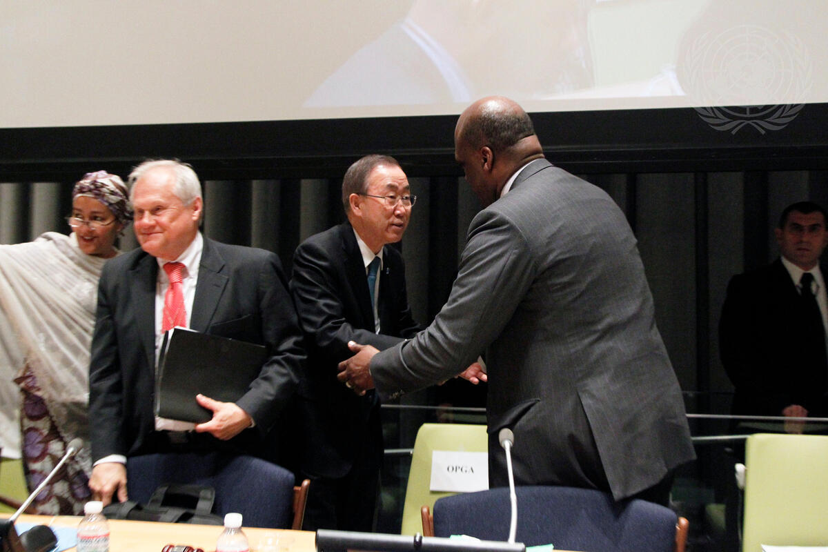 Secretary-General Ban Ki-moon (centre right) greets John Ashe, President of the sixty-eighth session of the General Assembly, at the opening meeting of the debate. Also pictured (from left): Amina J. Mohammed, the Secretary-General’s Special Adviser on Post-2015 Development Planning; and Martin Sajdik, Permanent Representative of Austria to the UN and ECOSOC President for 2014.