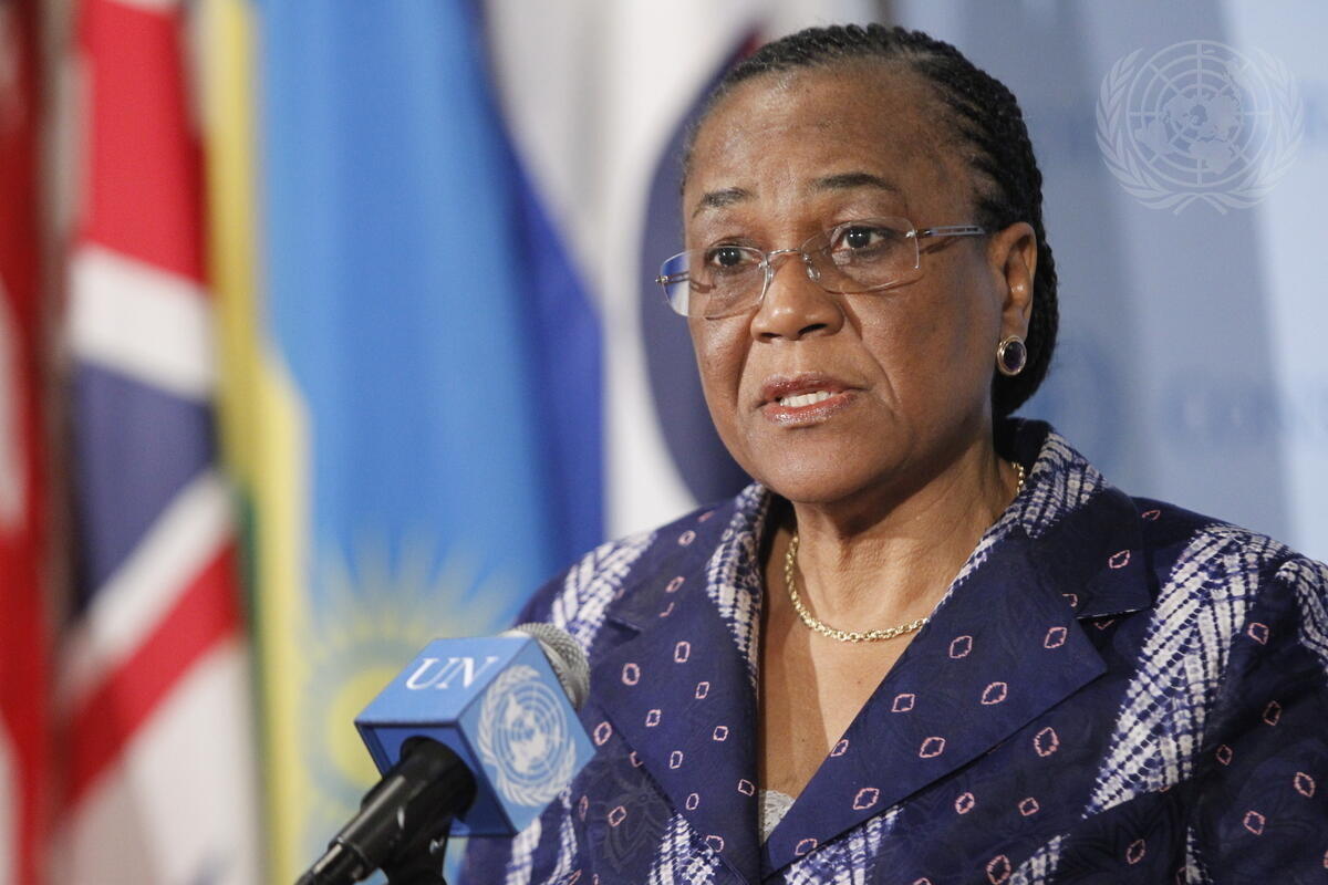 U. Joy Ogwu, Permanent Representative of Nigeria to the UN and President of the Security Council for April, speaks to journalists following a closed-door briefing to the Council by UN High Commissioner for Human Rights Navi Pillay on Syria, South Sudan, the Central African Republic, Mali and Libya.