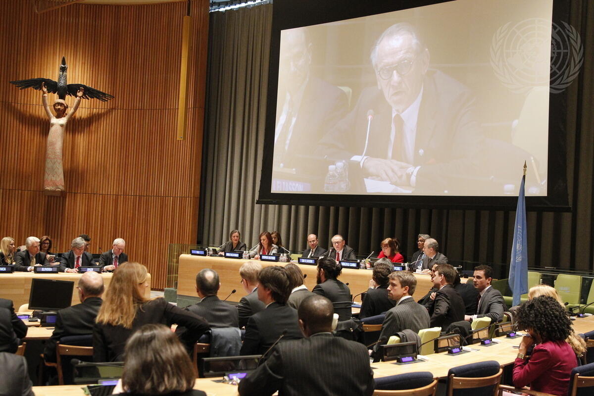 A view of the Trusteeship Council Chamber as Deputy Secretary-General Jan Eliasson (shown on screen) addresses a special even entitled, “One year after – One giant step closer”, on the occasion of the first anniversary of the adoption of the Arms Trade Treaty by the General Assembly. The event was co-organized by the Permanent Missions of France and Germany to the UN.