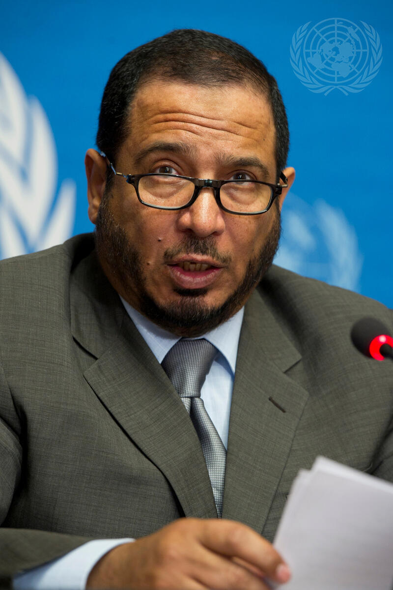 Abdullah Al-Matouq, Special Advisor of the Amir of the State of Kuwait and the UN Secretary General’s Humanitarian Envoy, briefs journalists following the ceremony in Geneva.