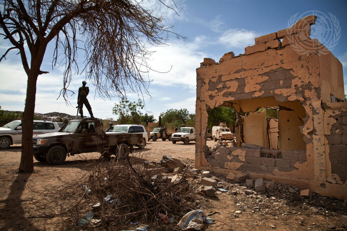 A Chadian peacekeeper with the UN’s mission in Mali (MINUSMA) stands beside a mortar-hit wall as Under-Secretary-General for Peacekeeping Operations, Hervé Ladsous, visits the site of a suicide attack that claimed two Chadian soldiers’ lives in Tessalit, Mali.