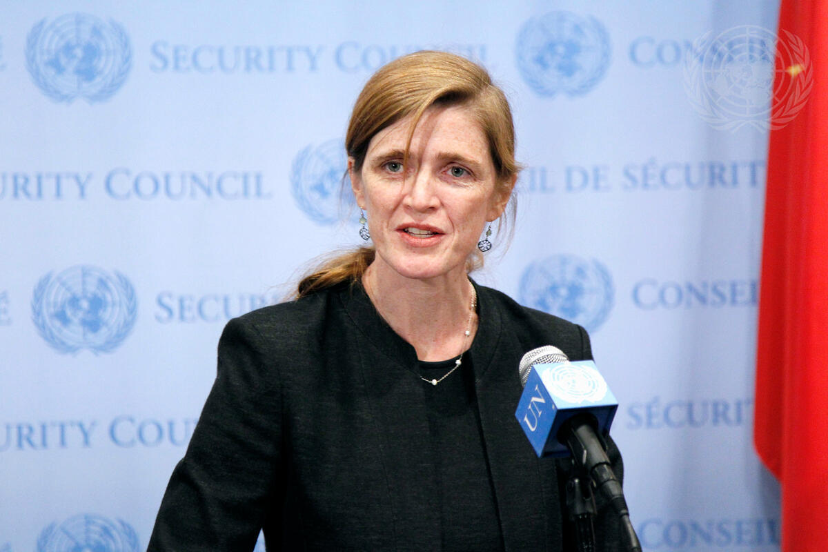 Samantha Power, United States Permanent Representative to the UN, briefs correspondents following the Security Council’s closed-door session on the Syrian chemical weapons programme.