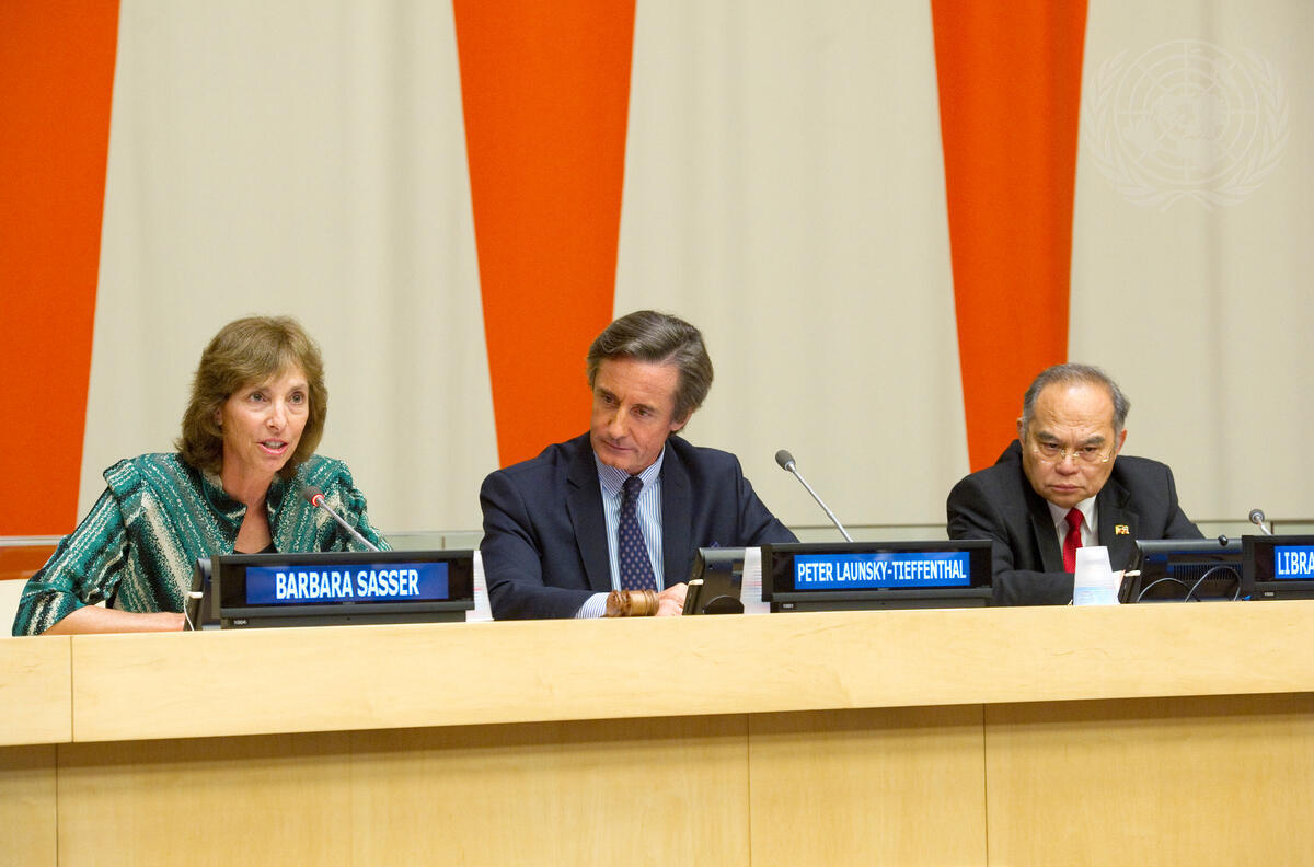 Barbara Sasser (left), co-Producer of the film speaks at the start of the screening. Also pictured: Peter Launsky-Tieffenthal (centre), Under-Secretary-General for Communications and Public Information; and Libran N. Cabactulan, Permanent Representative of the Republic of the Philippines to the UN.