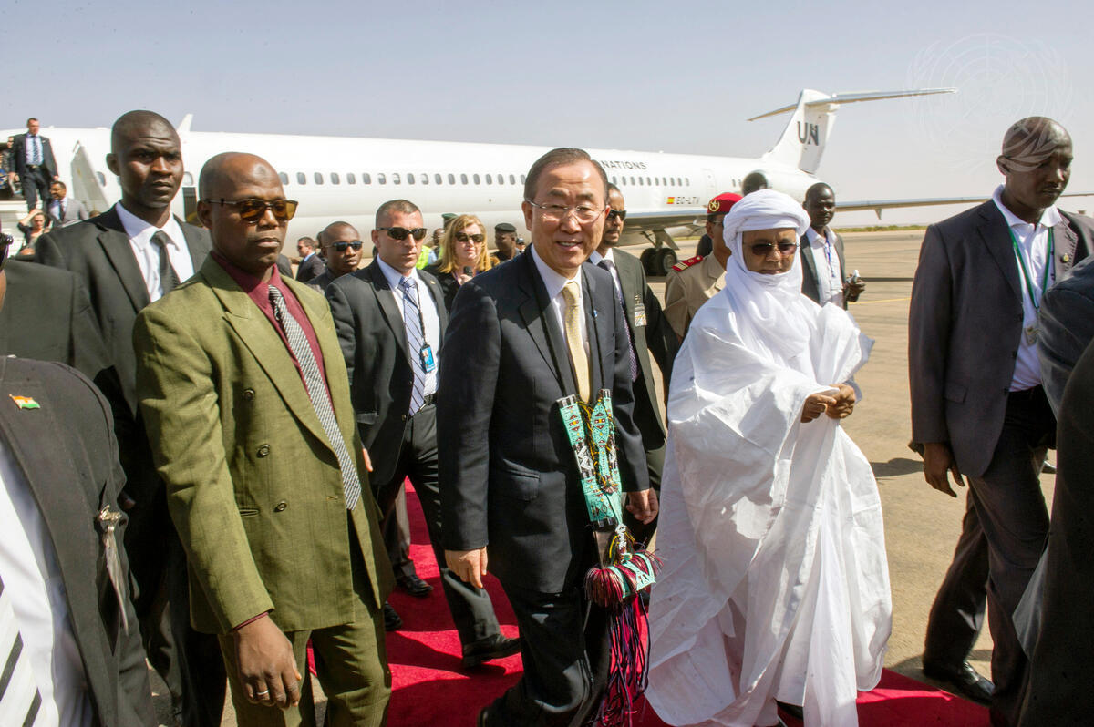 Secretary-General Ban Ki-moon (centre) is received by Brigi Raffini (centre right), Prime Minister of the Republic of Niger, on his arrival in the country.