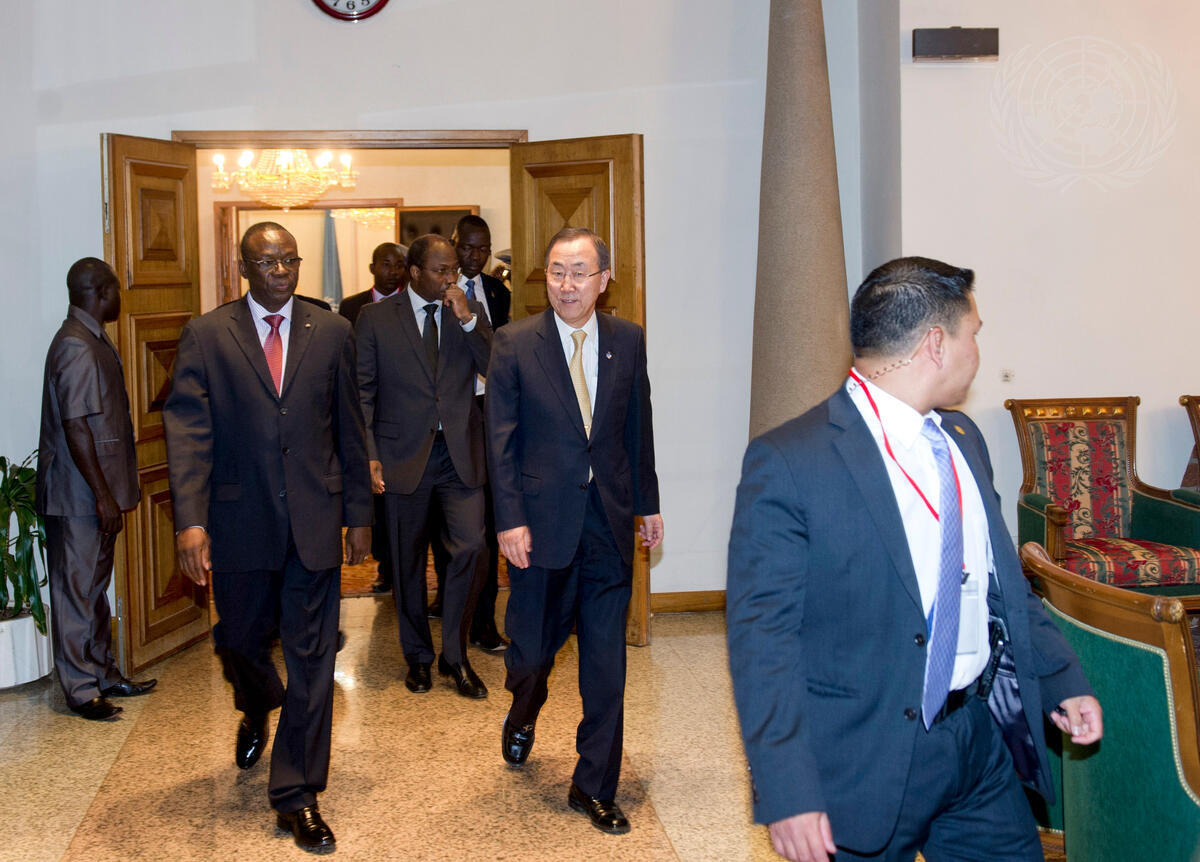 Secretary-General Ban Ki-moon (centre right) is met by Beyon Luc Adolphe Tiao (centre left), Prime Minister of Burkina Faso, on his arrival to the country.