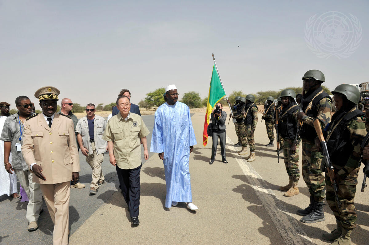 Secretary-General Ban Ki-moon (centre) arrives in Timbuktu with Oumar Tatam Ly (right of Mr. Ban, in blue), Prime Minister of the Republic of Mali.