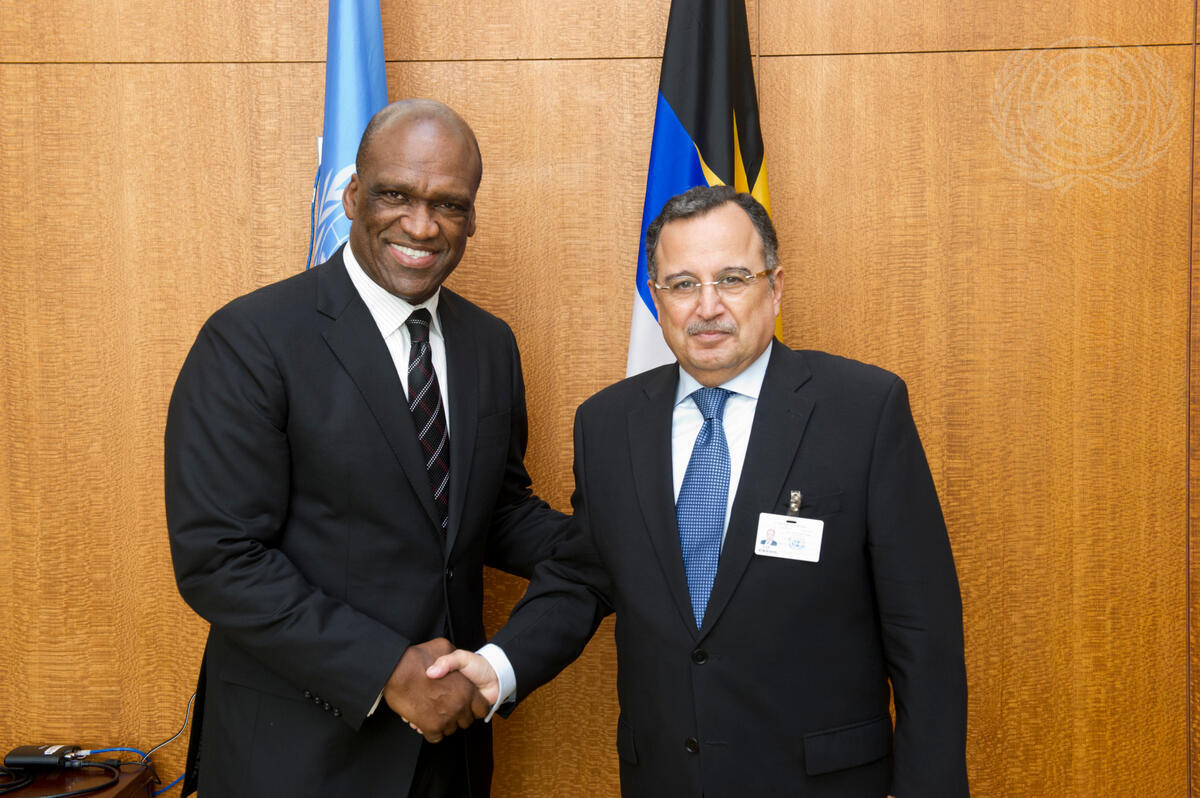 John W. Ashe (left), President of the sixty-eighth session of the General Assembly, meets with Nabil Fahmy, Minister for Foreign Affairs of the Arab Republic of Egypt.