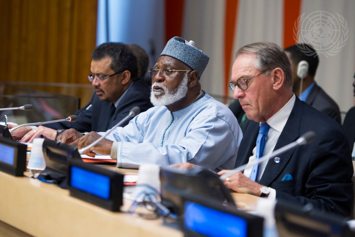 Abdulsalami Abubakar, former President of Nigeria and member of the African Union High-level Implementation Panel (AUHIP) on Sudan, addresses a meeting of the Sudan/South Sudan Consultative Forum. He is flanked by Tedros Adhanom Ghebreyesus (left), Minister for Foreign Affairs of the Federal Democratic Republic of Ethiopia; and Deputy Secretary-General Jan Eliasson.