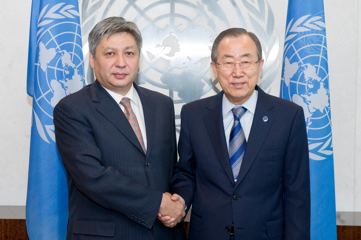Secretary-General Ban Ki-moon (right) meets with Erlan Abdyldayev, Minister for Foreign Affairs of the Kyrgyz Republic.