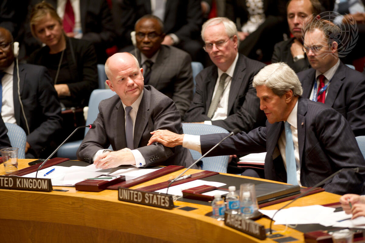 United States Secretary of State John Kerry (right) reaches out to William Hague, Secretary of State for Foreign and Commonwealth Affairs of the United Kingdom, during the latter’s statement to the Council.