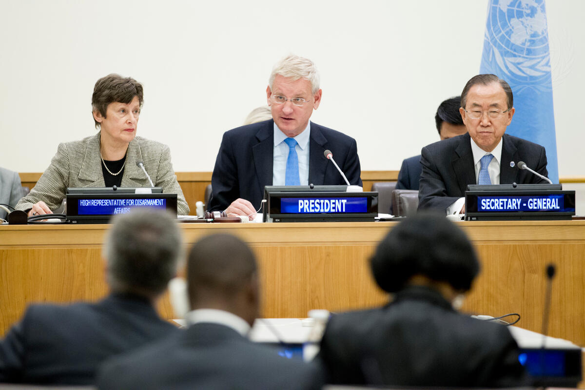 Carl Bildt (centre), Minister for Foreign Affairs of Sweden and outgoing President of the Conference on Facilitating the Entry into Force of the Comprehensive Nuclear-Test-Ban Treaty (CTBT), speaks at the Eighth CTBT Conference. He is flanked by Angela Kane (left), UN High Representative for Disarmament Affairs, and Secretary-General Ban Ki-moon.