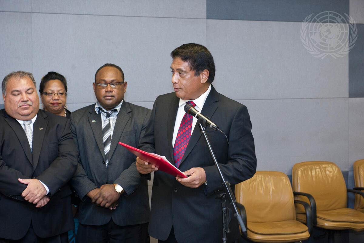 Lord Tu'ivakano (right), Prime Minister and Minister for Foreign Affairs of the Kingdom of Tonga, hands over the Declaration on Establishing a “Pacific Regional Data Repository for Sustainable Energy for All” during a meeting of leaders of the Pacific Islands Forum (PIF) with Secretary-General Ban Ki-moon.