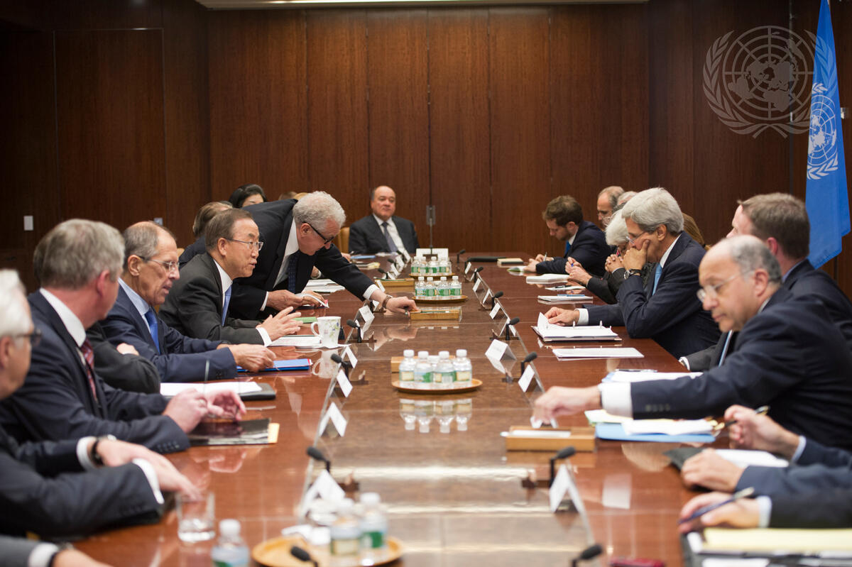 Pictured (clockwise, starting third from left): Sergey V. Lavrov, Minister for Foreign Affairs of the Russian Federation; the Secretary-General; Joint Special Representative Lakhdar Brahimi. On opposite side of table: Laurent Fabius (right), Minister for Foreign Affairs of France; United States Secretary of State John Kerry (third from right).