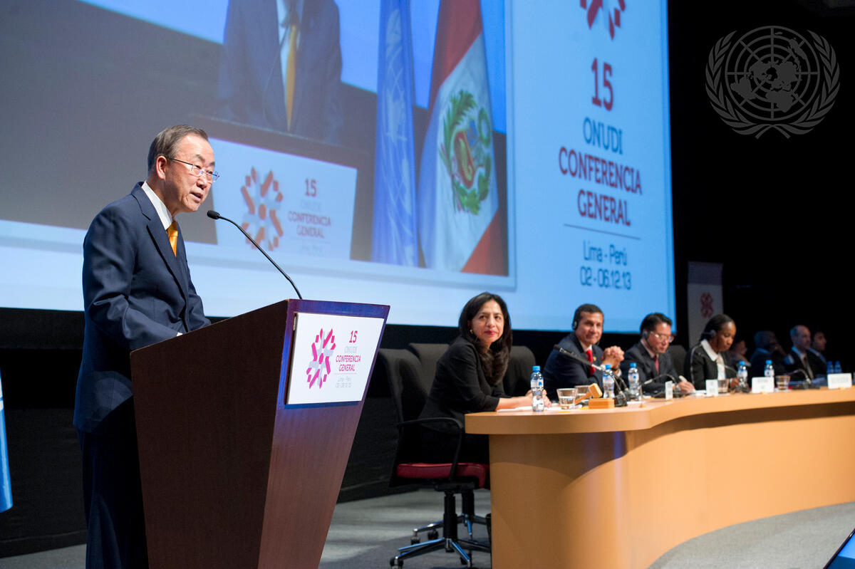 Secretary-General Ban Ki-moon (left) addresses the UN Industrial Development Organization (UNIDO)’s 15th General Conference as the new Lima Declaration is adopted. A successor to the original Lima Declaration of forty years ago, it stresses the relevance of inclusive and sustainable industrial development as the basis for sustained economic growth.