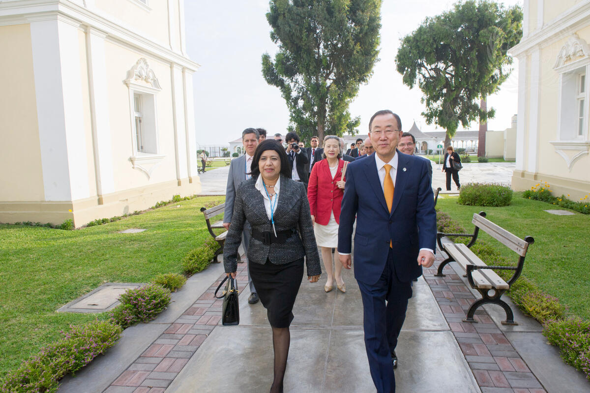 In Lima for the opening of the 15th session of the General Conference of the UN Industrial Development Organization (UNIDO), Secretary-General Ban Ki-moon (right) visits the UN office in the Peruvian capital, accompanied by Rebeca Arias (left), UN Resident Coordinator in the country. Also pictured: Mr Ban’s wife, Yoo Soon-taek (centre).