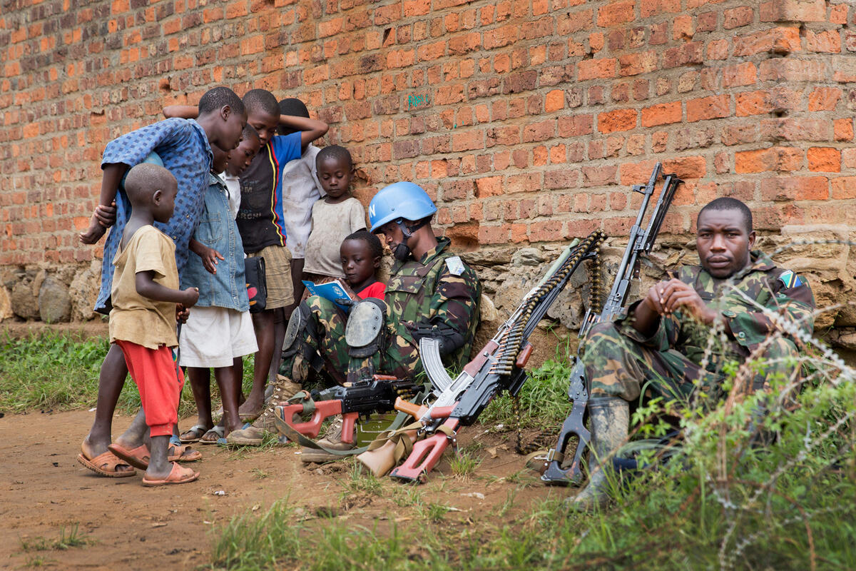 Members of the Tanzanian contingent of the Force Intervention Brigade (FIB), UN Organization Stabilization Mission in the Democratic Republic of the Congo (MONUSCO), with children of the town of Pinga, North Kivu Province, during their patrol of the town.