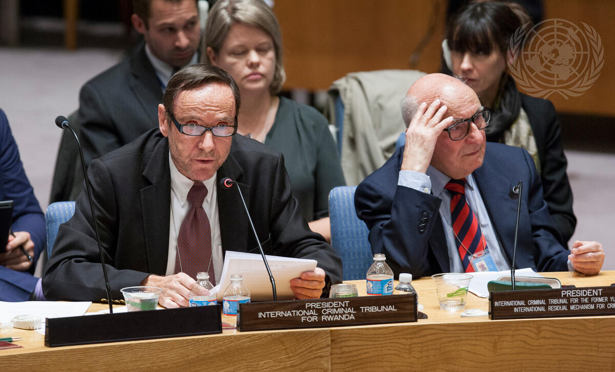 Vagn Joensen (left), President of the International Criminal Tribunal for Rwanda (ICTR), briefs the Security Council. To the right of Mr. Joensen is Theodor Meron, President of the International Criminal Tribunal for the Former Yugoslavia (ICTY) and President of the International Residual Mechanism for Criminal Tribunals.