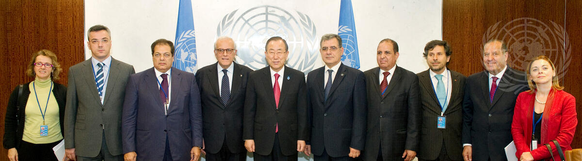 Secretary-General Ban Ki-moon (centre left) meets with Sergio Piazzi (centre right), Secretary General of the Parliamentary Assembly of the Mediterranean, and other members of the Assembly.